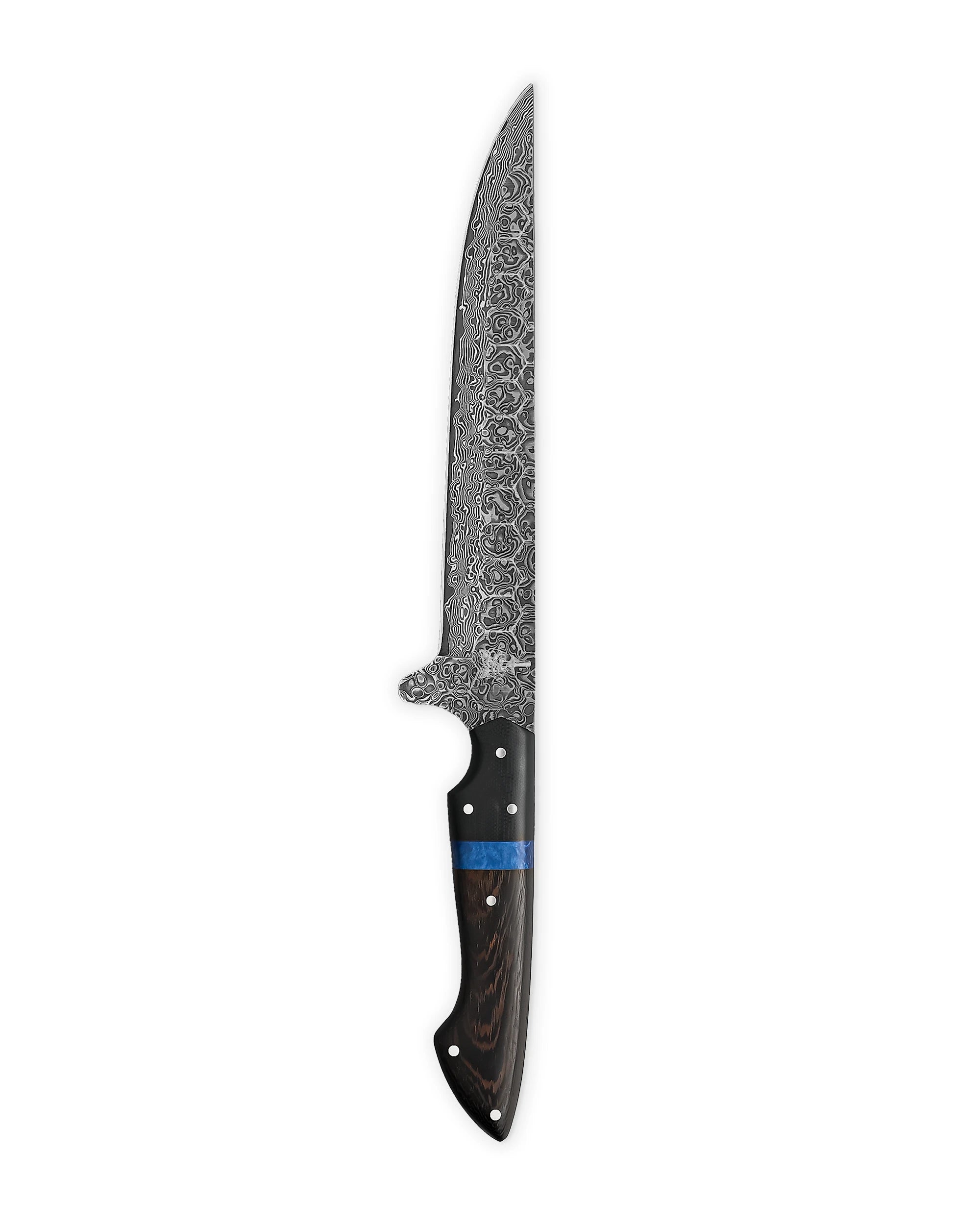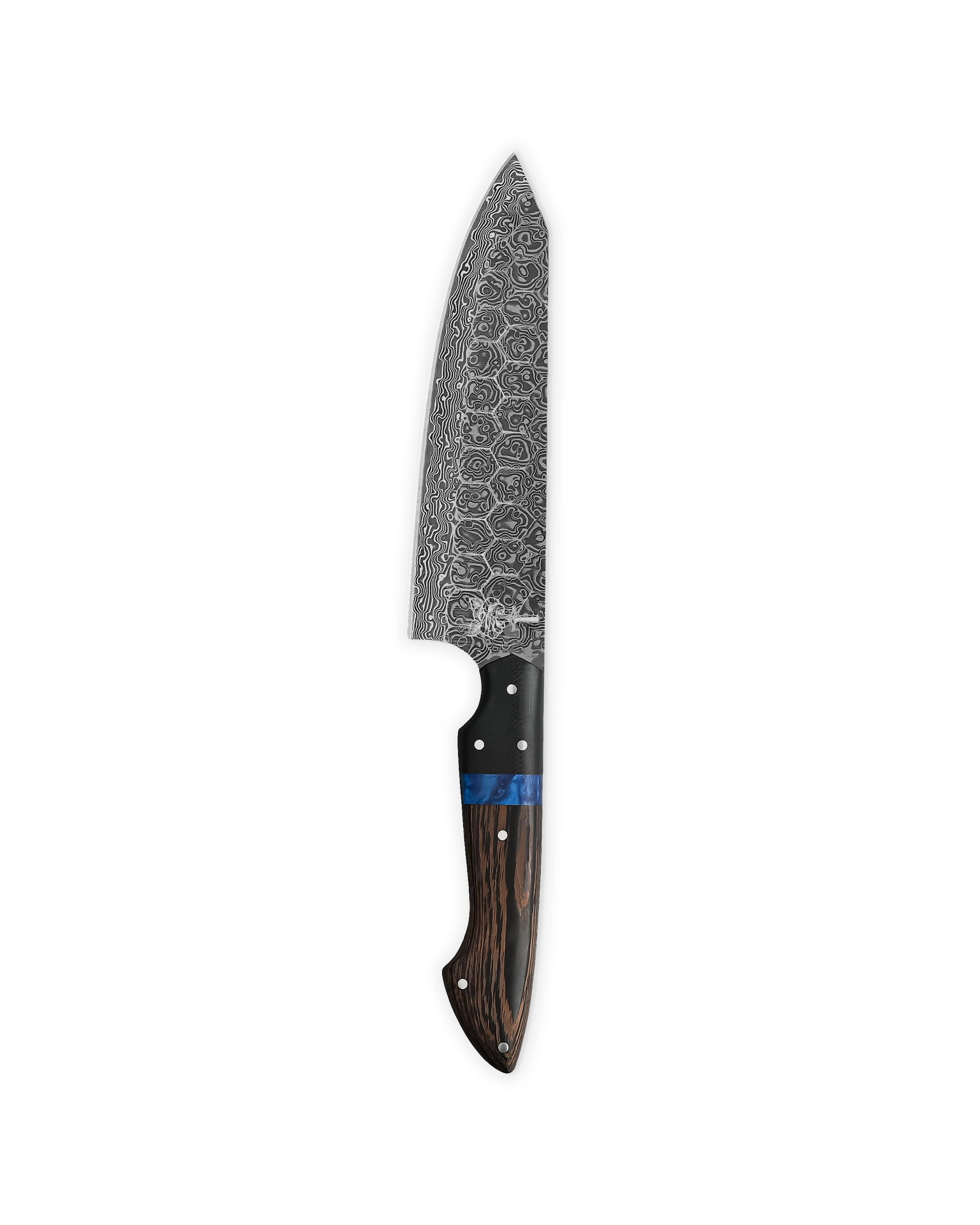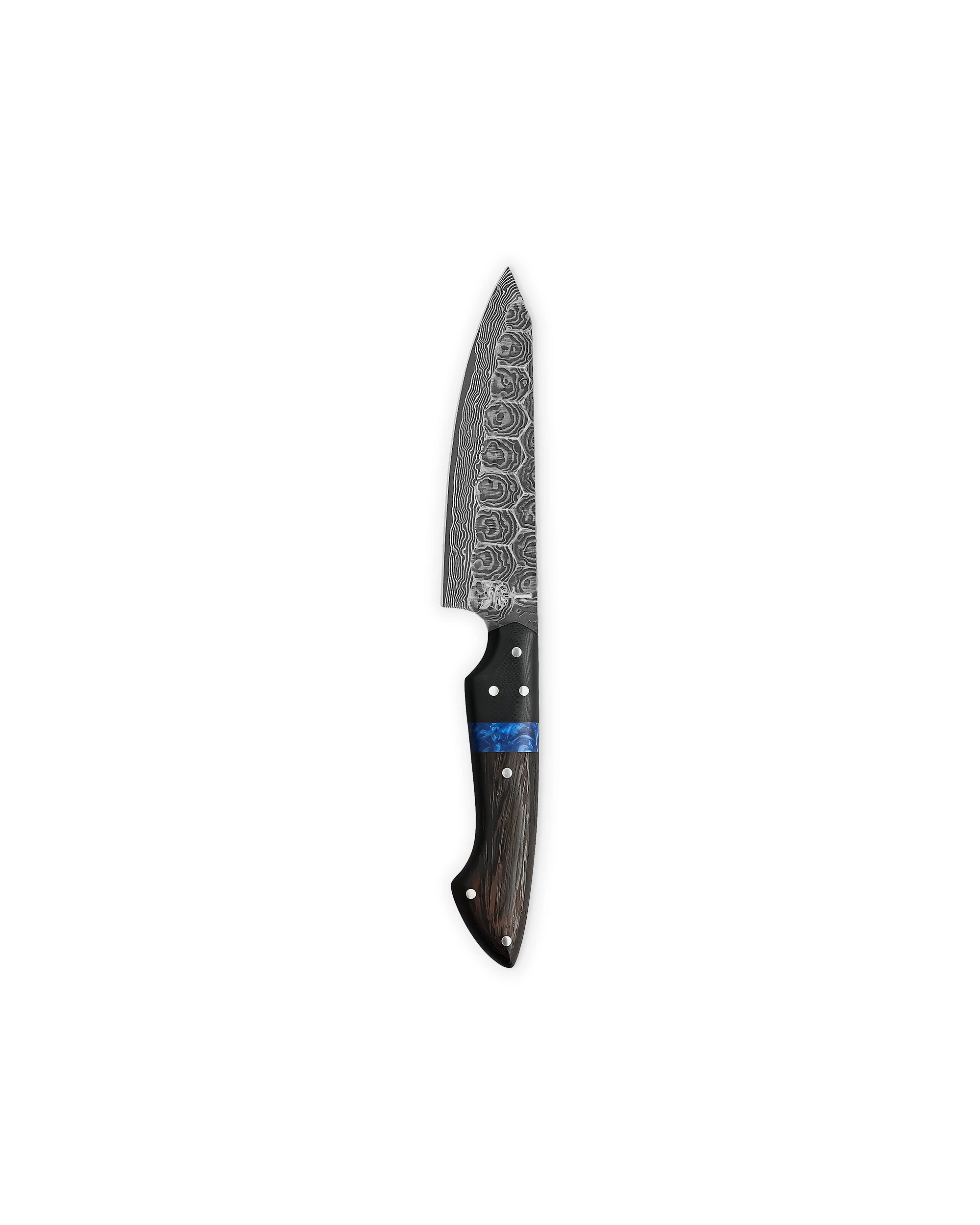 The distinct blue swirl resin stripe adds a striking visual contrast, seamlessly joining the G10 bolster with the rich, grainy Wenge wood handle. Whether you’re perfecting a new dish or slicing through your daily prep, the Dahlia Collection brings professional-grade performance and elegance to every meal.